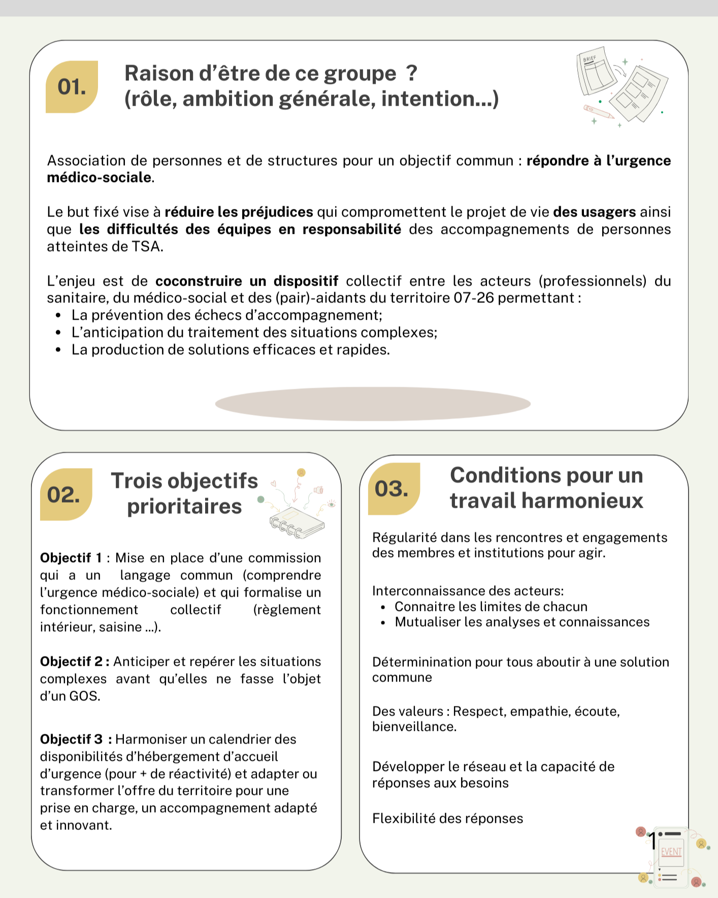 La première rencontre du groupe visait à définir la problématique, faire ressortir les besoins et enjeux en terme d'urgences médicosociales sur le territoire et à désigner le ou les commanditaires du Groupement d'Intérêt et d'Etudes.