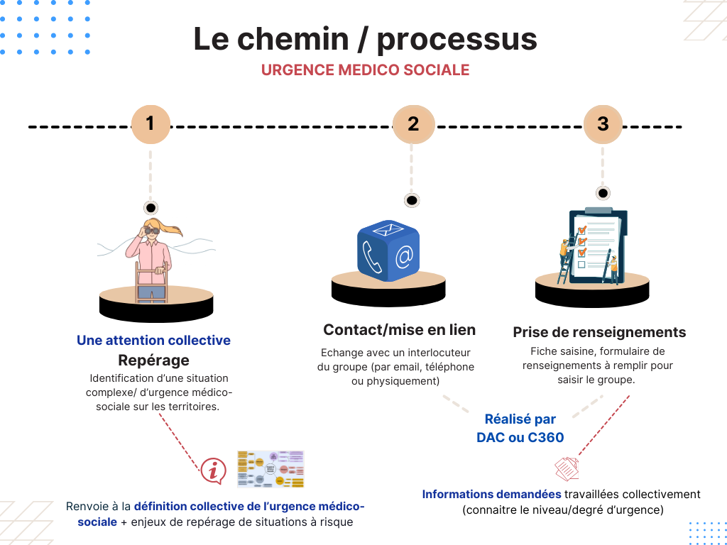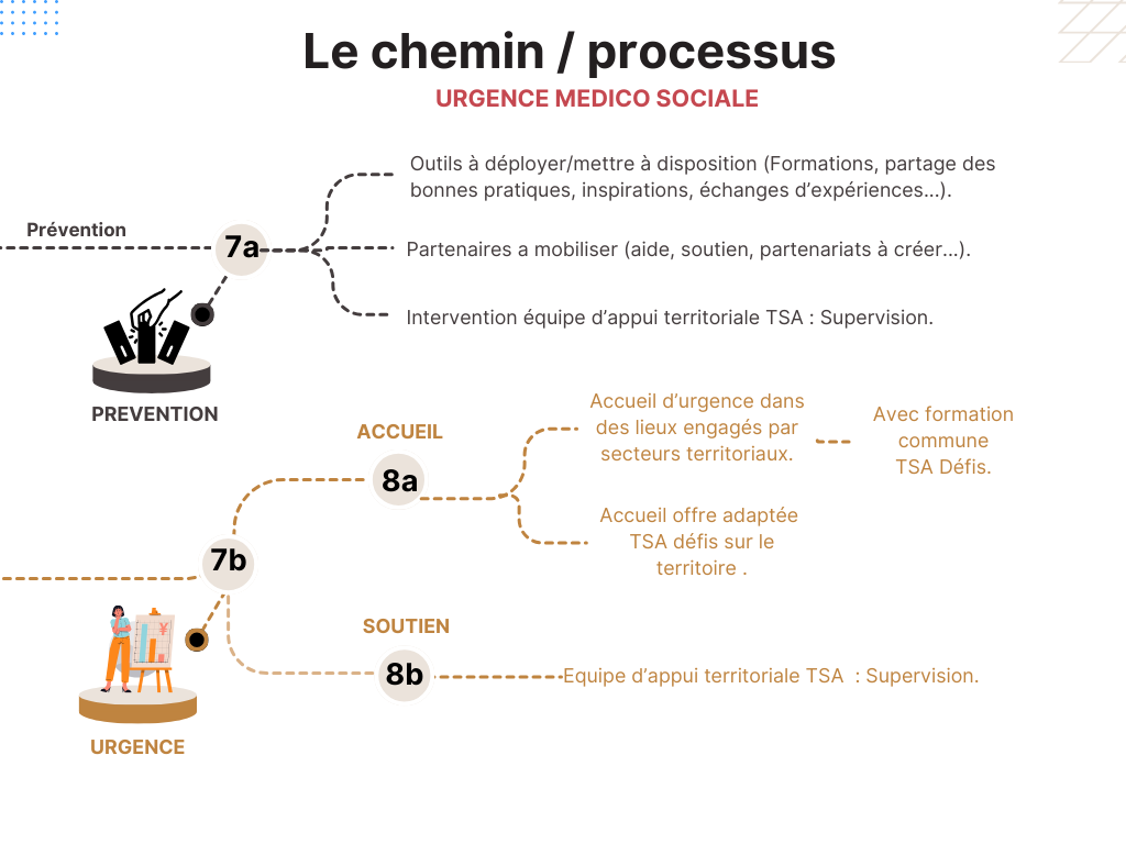 Certains parcours cumulent les urgences (médico-sociale, sanitaire, sociale et vitale) à l’image du parcours présenté ci-contre.
